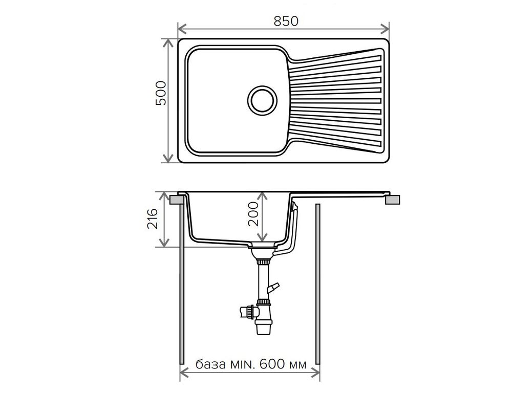 Минимальный размер тумбы под мойку, мм 600
